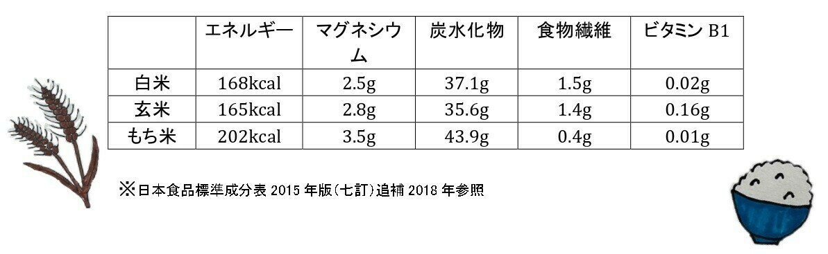 玄米は糠や胚芽は残ったままであるので、うるち米に比べると、特にビタミンB群が多く含まれており、ビタミンB1はうるち米の約8倍となっています!