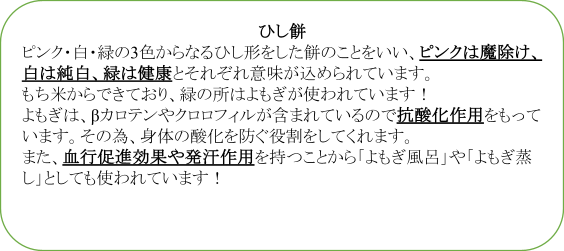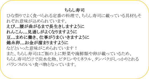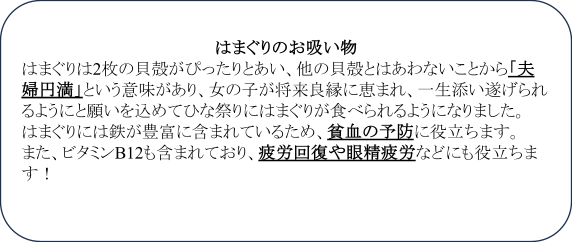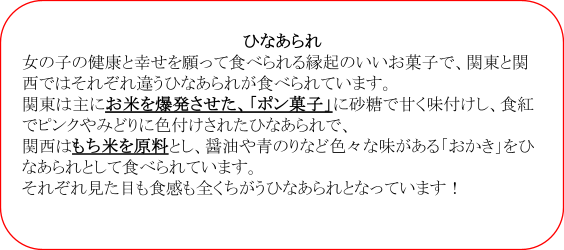 「ひな祭りは一般的にはひな人形が飾られ、 ひなあられ・ひし餅・甘酒・はまぐりのお吸い物・ちらし寿司が食べられます!